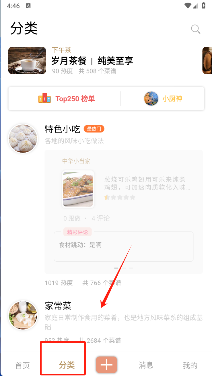 2、查看分类菜谱,点击底部导航栏中的“分类”图标,浏览不同类别的菜谱。