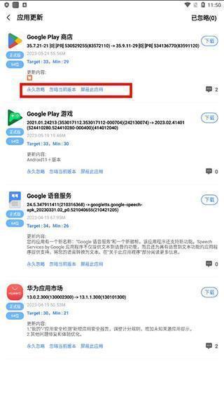 3、当然,您也可以选择忽略您不想更新的应用,这是您的权利