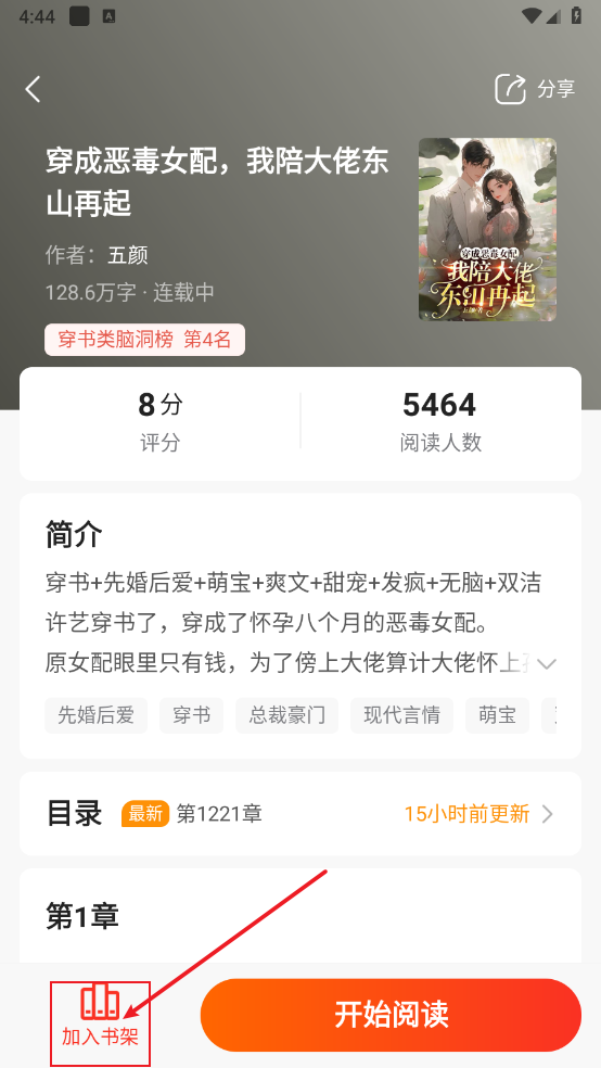 2. 一键点击即可打开并进入小说详情页面,随后点击页面左下角的“加入书架”选项。