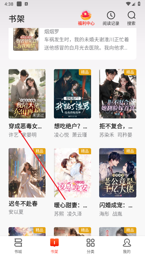 3、点开“书架”板块,便能瞧见收藏的小说资源。