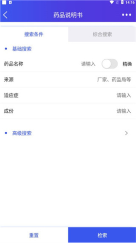 3、点击药品说明书,进入相应页面。在该页面,用户输入药品名称、来源等信息,即可检索到药品的使用说明。