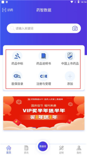 2、登陆后进入首页,为用户提供了药品中标,药瓶说明书,中国上市药,医保目录,注册与受理等快捷入口,点击添加用户还可以自由添加各种快捷入口。