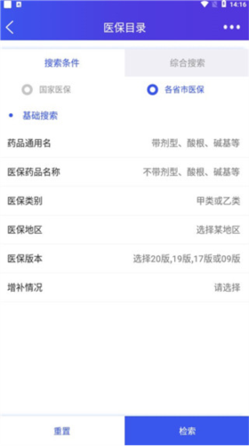 4、点击进入医保目录,用户可以检索国家及各省市的药品医保情况。