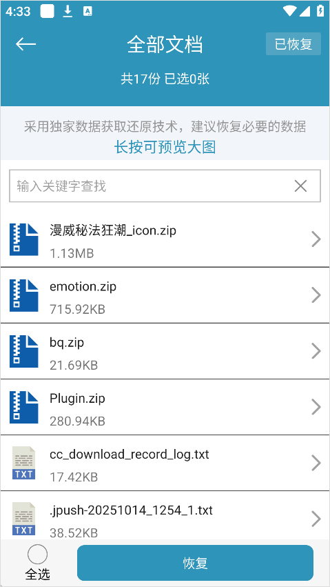 2. 系统将自动启动对手机存储文件的扫描,待扫描结束,勾选需找回的文档。