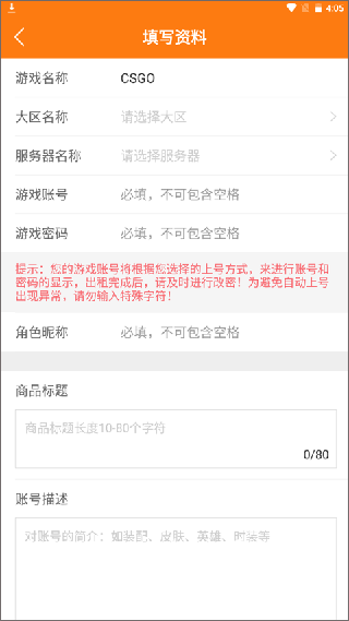 3、接下来就是填写你游戏账号的资料,一定要真实,不然会影响你在平台上的信誉。最后根据提示完成相应的操作即可发布成功。