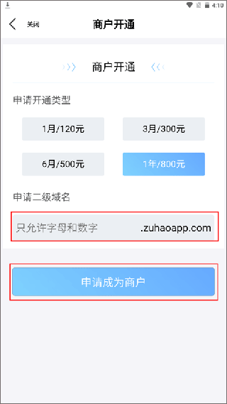 (3)下面就是申请你的网站二级域名,根据提示输入你想好的名称后,点击申请成为商户就可以了,等待工作人员审核通知即可。