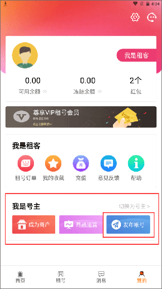 1、首先进入优号租最新版首页,切换至【我的】功能模块界面。此界面涵盖租客与号主两种身份,若要发布游戏账号信息,点击右侧“发布账号”按钮。
