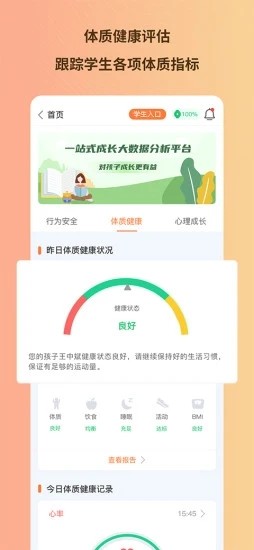 1.学生体能大数据,家校共享健康动态。基于学生身体健康状况,实时监控学生运动状况进行大数据分析,并形成健康报告,为家长提供学生健康管理的实时信息。
