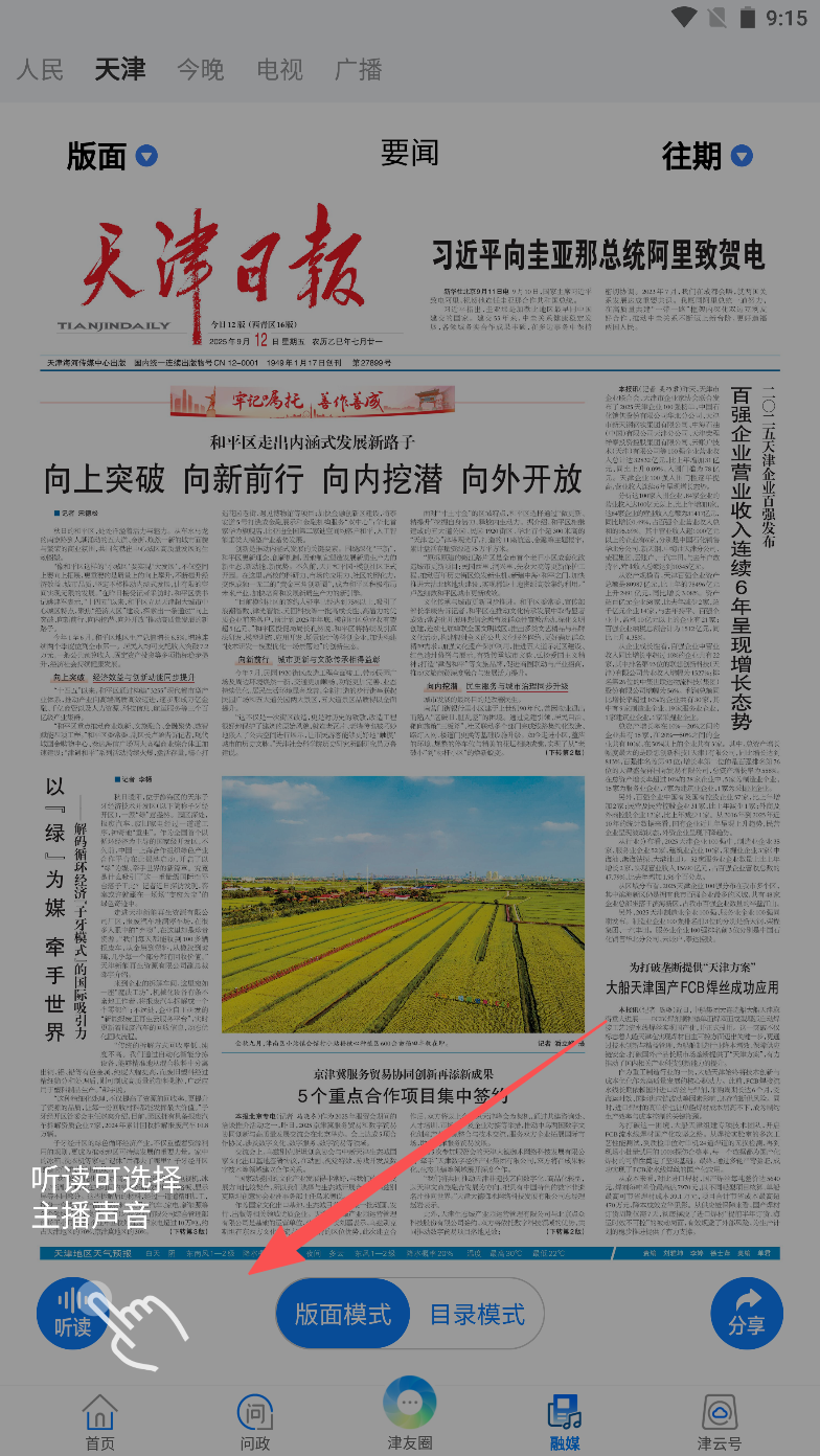 4、点击底部导航栏的“融媒”选项,选择版面模式或目录模式阅读详细报道。
