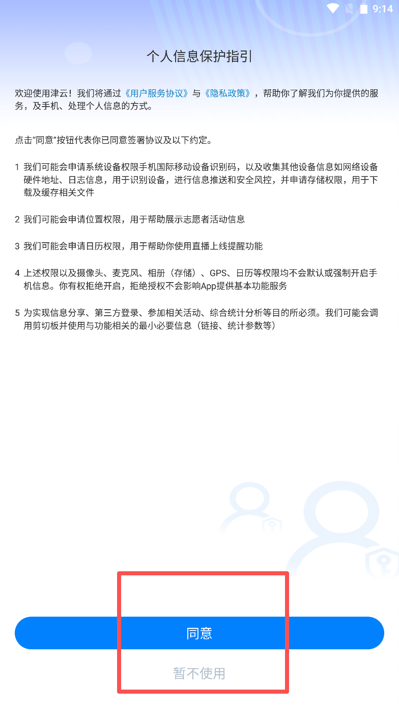 1、点击“同意”按钮,同意个人信息保护指引,开始使用津云新闻客户端。
