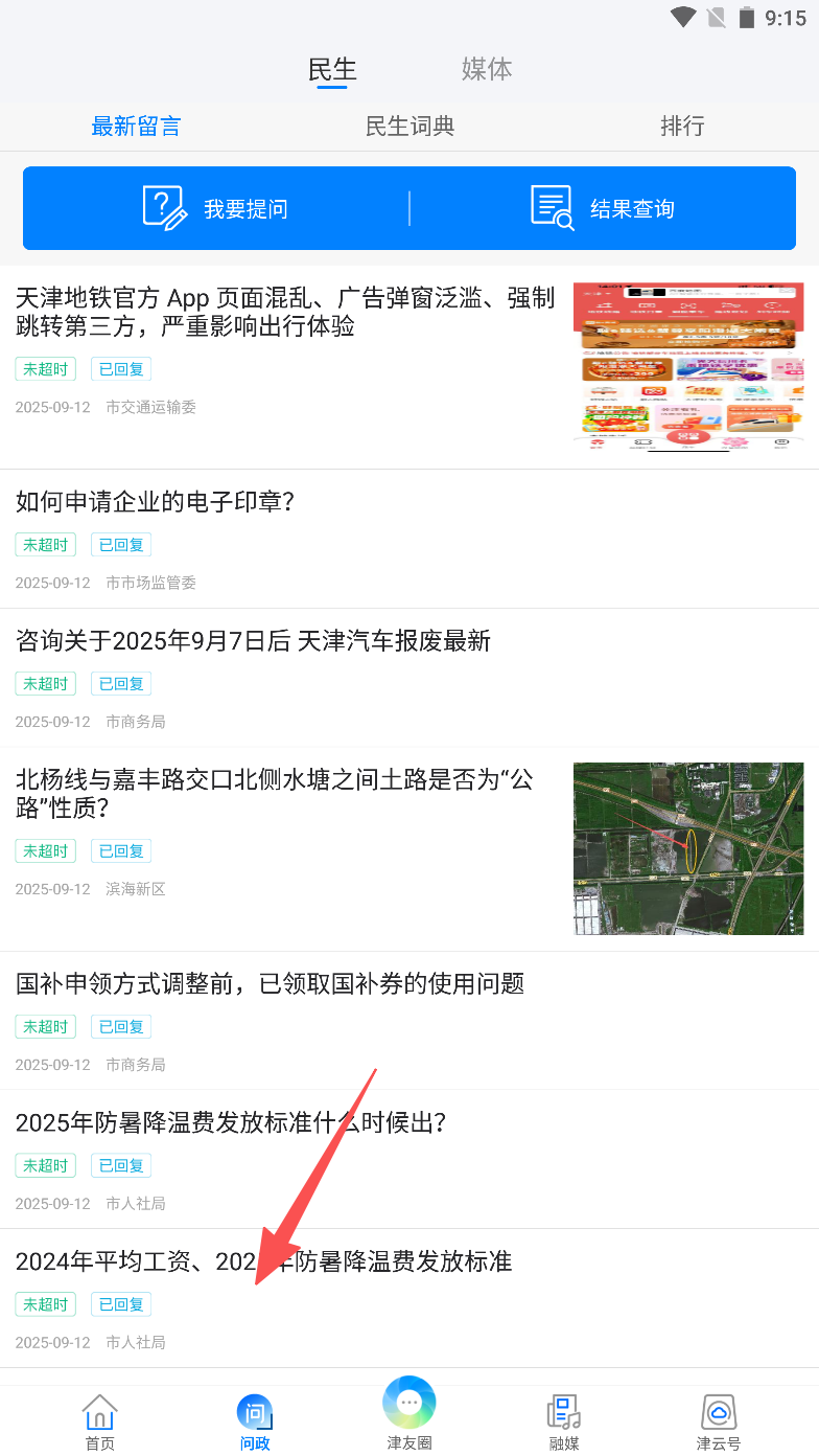 3、点击底部导航栏的“问政”选项,查看民生问题和相关政策解答。
