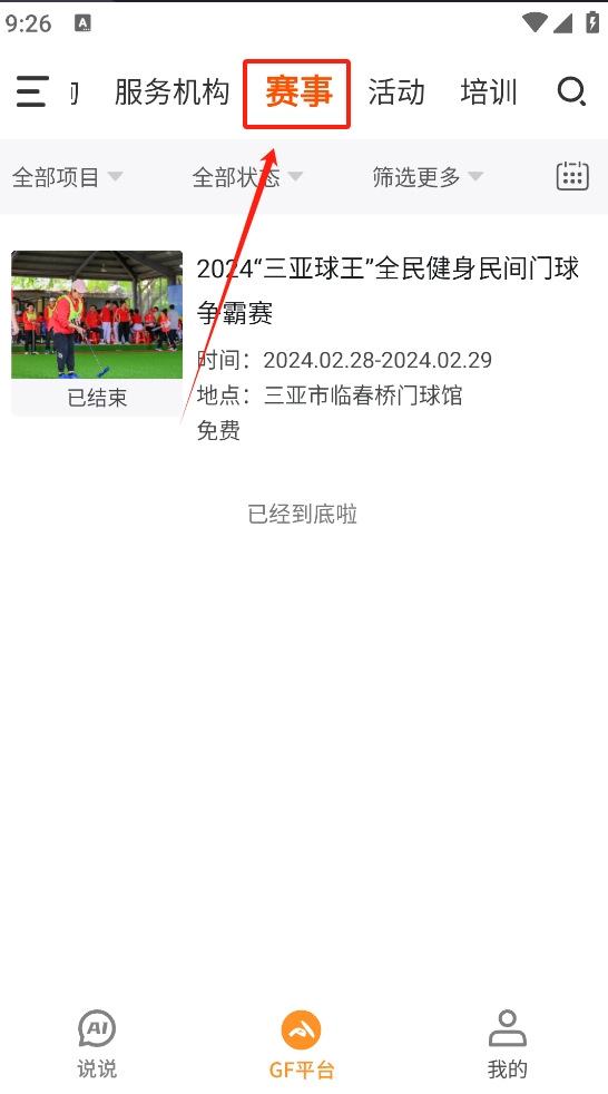 4、点击“赛事”标签,查看已结束和即将开始的赛事信息。
