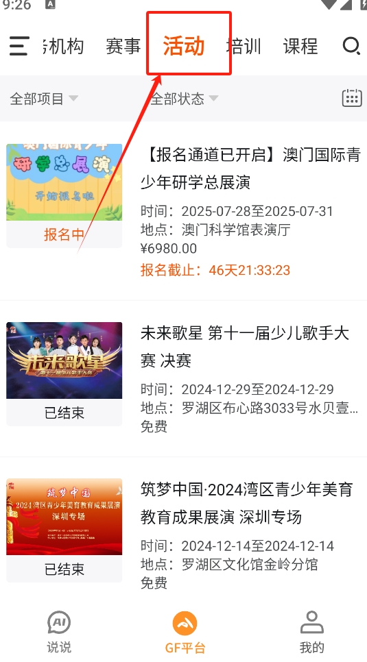 3、点击“活动”标签,查看当前可报名的活动列表及详情。