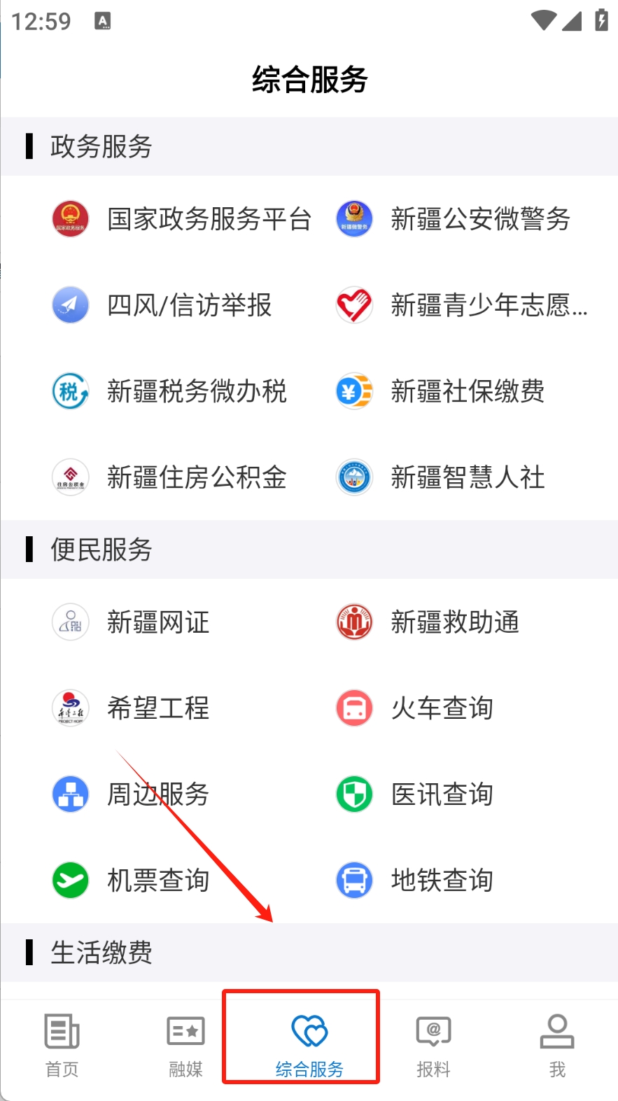 3、使用综合服务:点击综合服务图标访问各类便民服务。