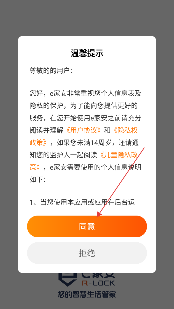 1、首次打开e家安,弹出协议提示,点击【同意】进入。