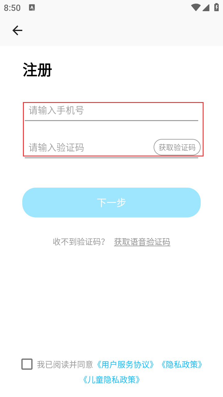 4、跳转至注册页,填写手机号,点击【获取验证码】,输入后勾选协议,点【下一步】。