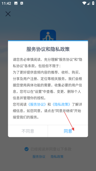 1、打开应用查看协议点击同意。