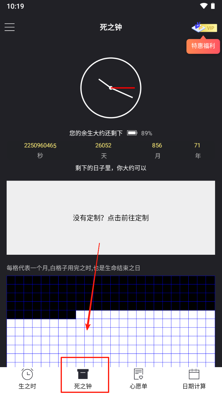 3、查看死之钟:点击“死之钟”选项,查看预计剩余生命时间。