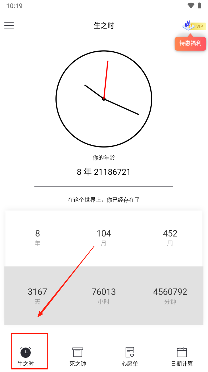2、查看生之时:点击“生之时”选项,查看自出生以来的时间统计。
