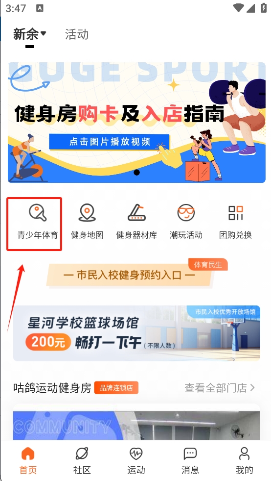 1、打开应用首页,点击“青少年体育”图标,进入相关活动页面。