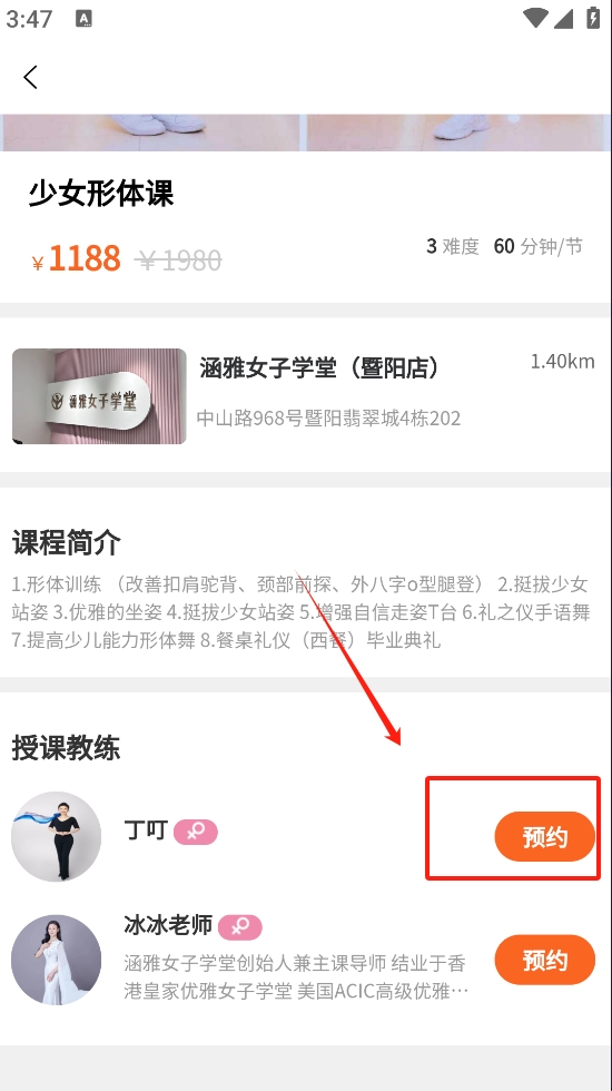 3、选择“少女形体训练体验课单节”,点击课程下方的“预约”按钮。