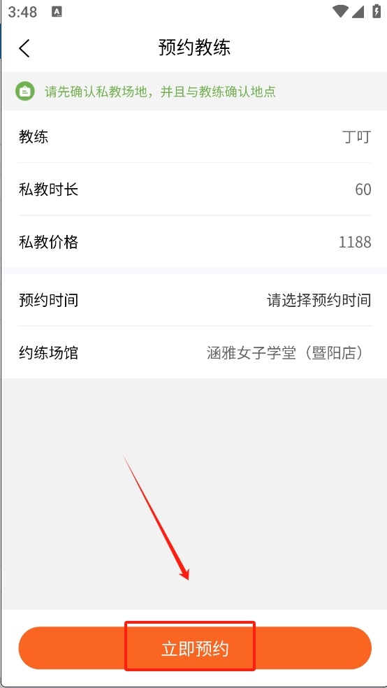 4、在预约页面,确认教练、时间和地点,点击“立即预约”完成预约。