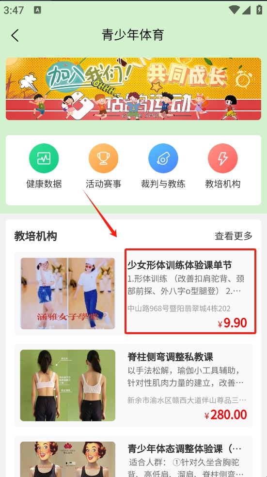 2、在青少年体育页面中,点击“培训机构”选项,查看课程列表,浏览并选择感兴趣的课程。