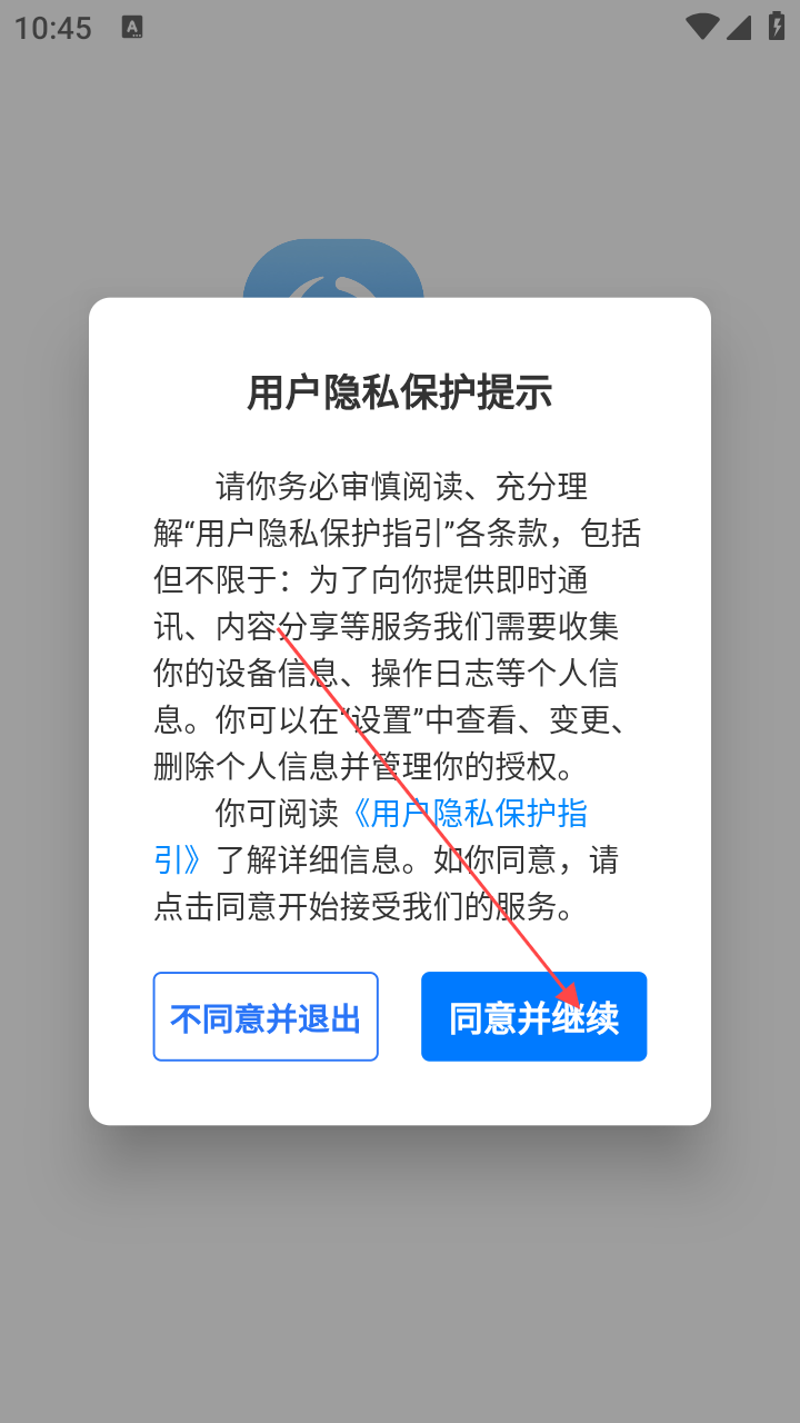 1、首次使用应用,阅读【用户隐私保护提示】,点【同意并继续】接受隐私政策。