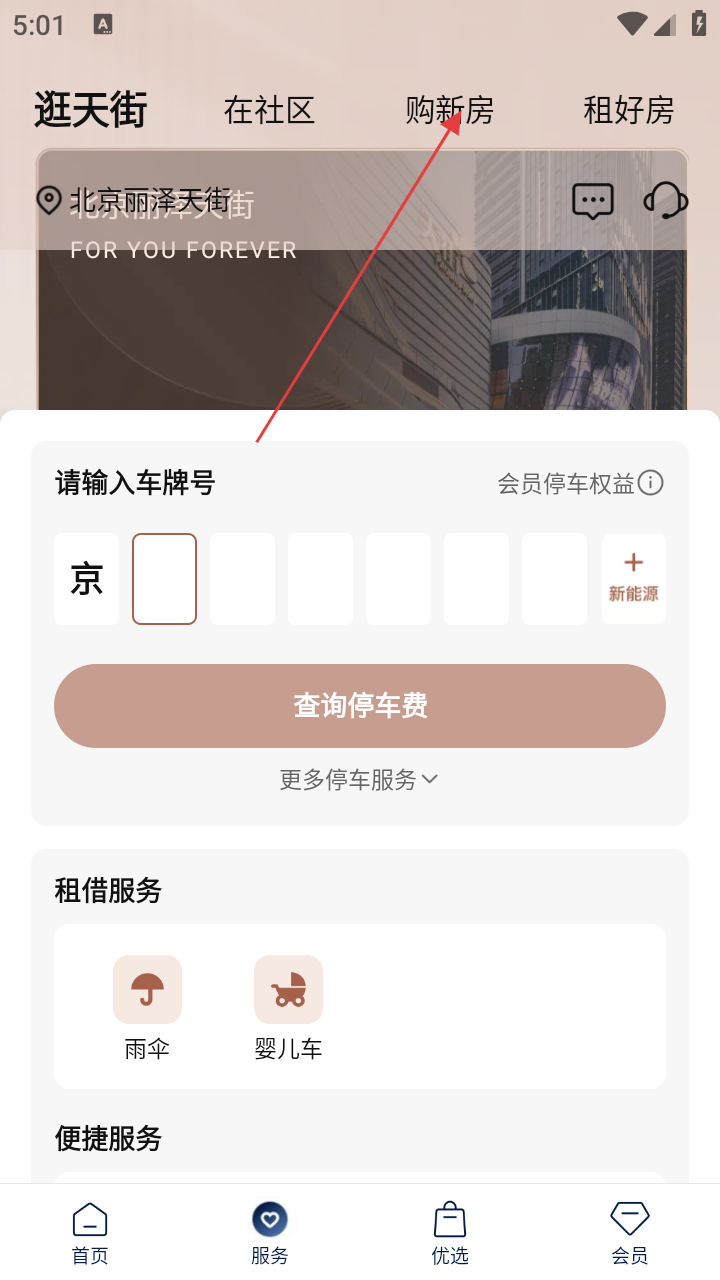 2、在服务页面,点击顶部【购新房】选项,进入购新房页面。