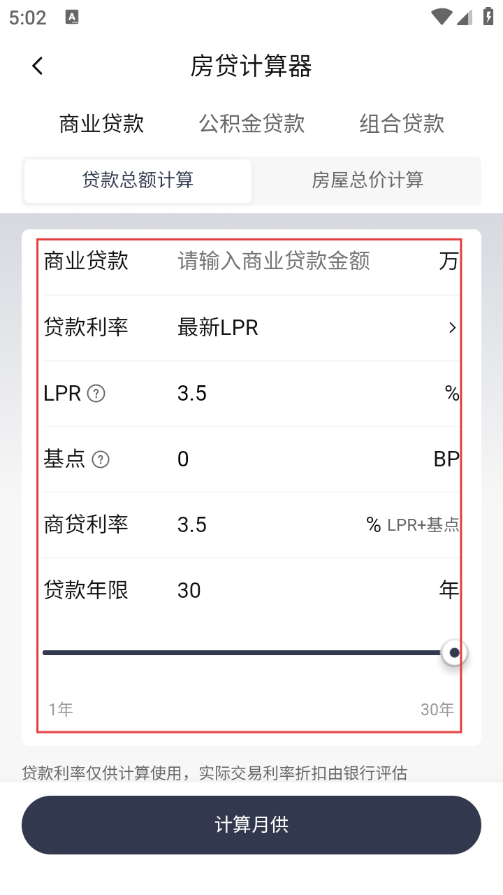 4、在房贷计算器页面,选择贷款类型,输入贷款金额等相关信息,点击【计算月供】按钮,即可计算出月供金额。