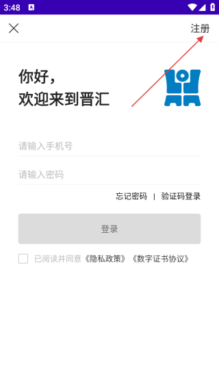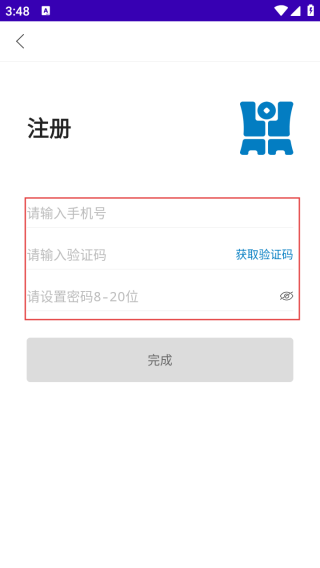 3、进入注册界面输入手机号和验证码以及密码即可注册。