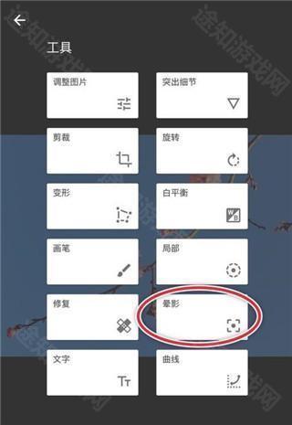 3、基本参数调整完毕后,可依据图片需求,在工具栏挑选合适项目进一步调整。例如,能够对【晕影】的柔和度进行调节。