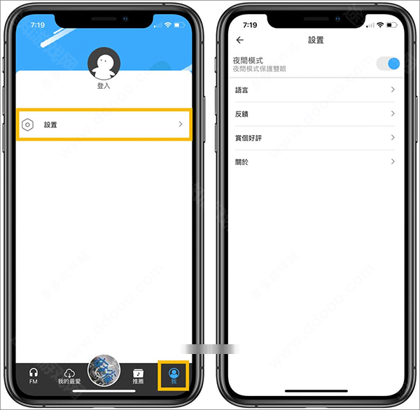 7、最后还有一个设置的功能,里面可以设定开启「夜间模式」,这项功能主要是让萤幕变暗,而非真的音乐播放器背景全部改为暗色系,如果想要改成其他国家语系,也可以透过设定内去调整。