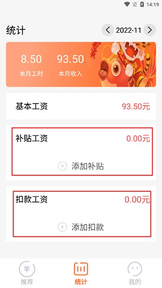 4.添加补贴/扣款:进入「统计」界面 → 点击「添加补贴」或「添加扣款」→ 填写金额并保存,系统自动更新净收入。