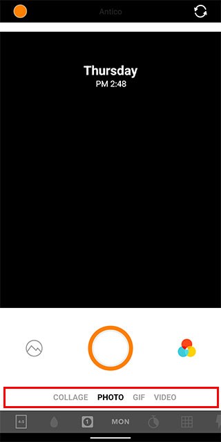 3.选择拍摄模式:工具栏上方切换拍摄类型 → 从左到右依次为「拼贴连拍」(多图拼接)、「单张拍摄」、「GIF动图」、「视频录制」。