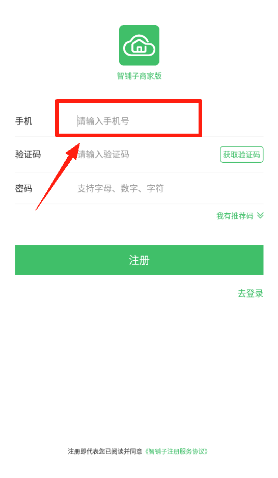 2、输入手机号和验证码。在注册页面输入手机号并获取验证码进行验证。