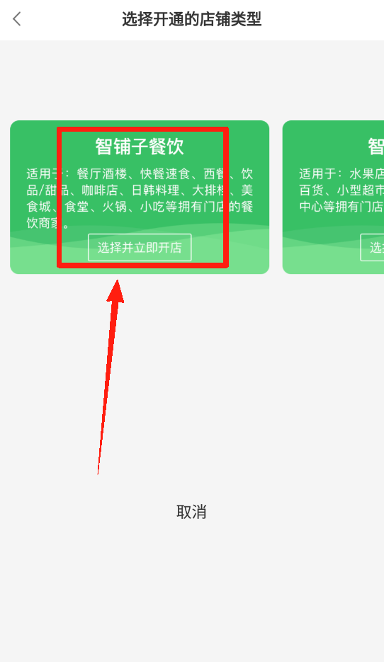 3、选择店铺类型。选择“智铺子餐饮”并点击“选择并立即开店”以开通店铺。