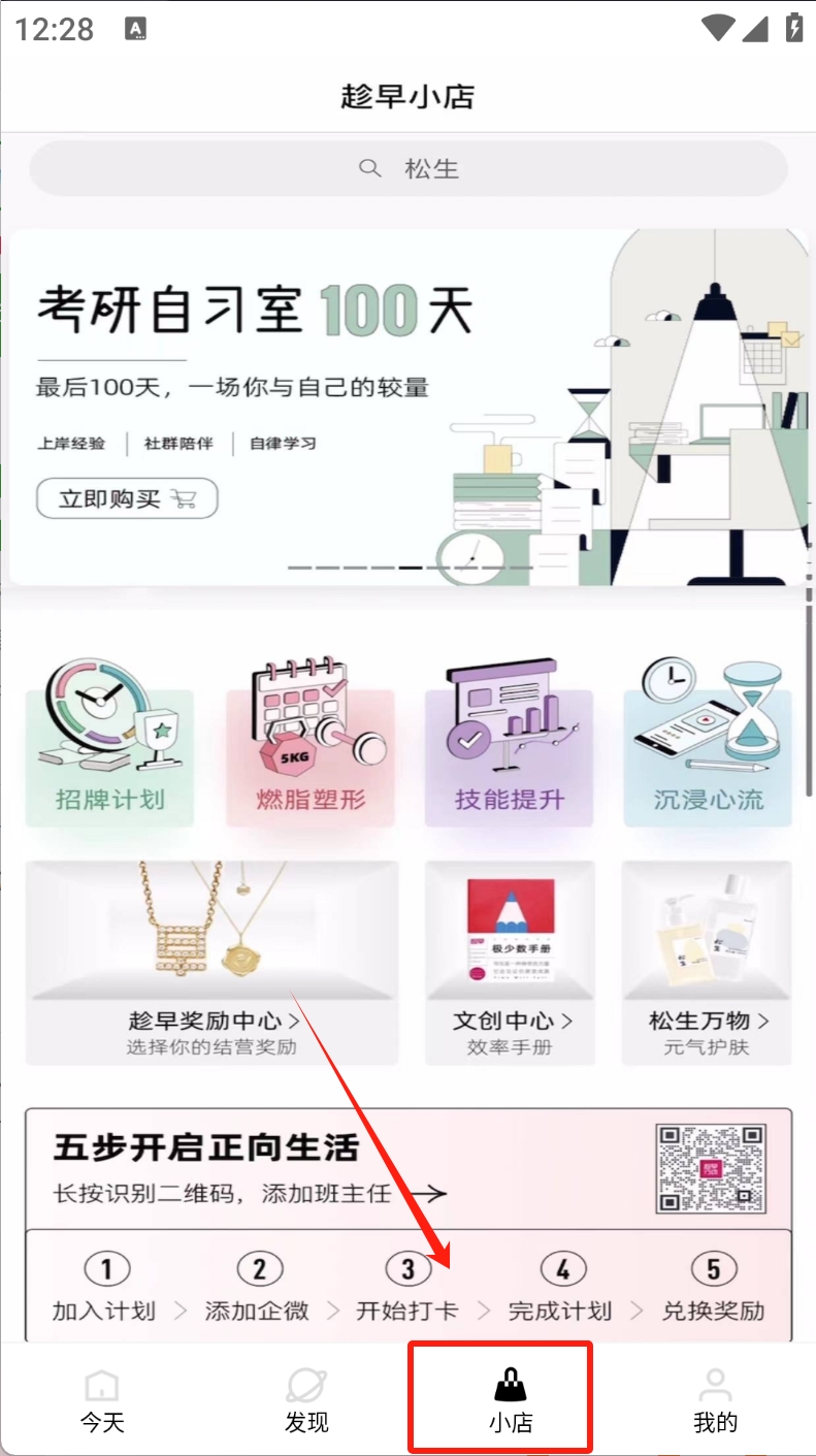 3、访问小店:点击底部“小店”图标,探索更多自律学习和奖励计划。