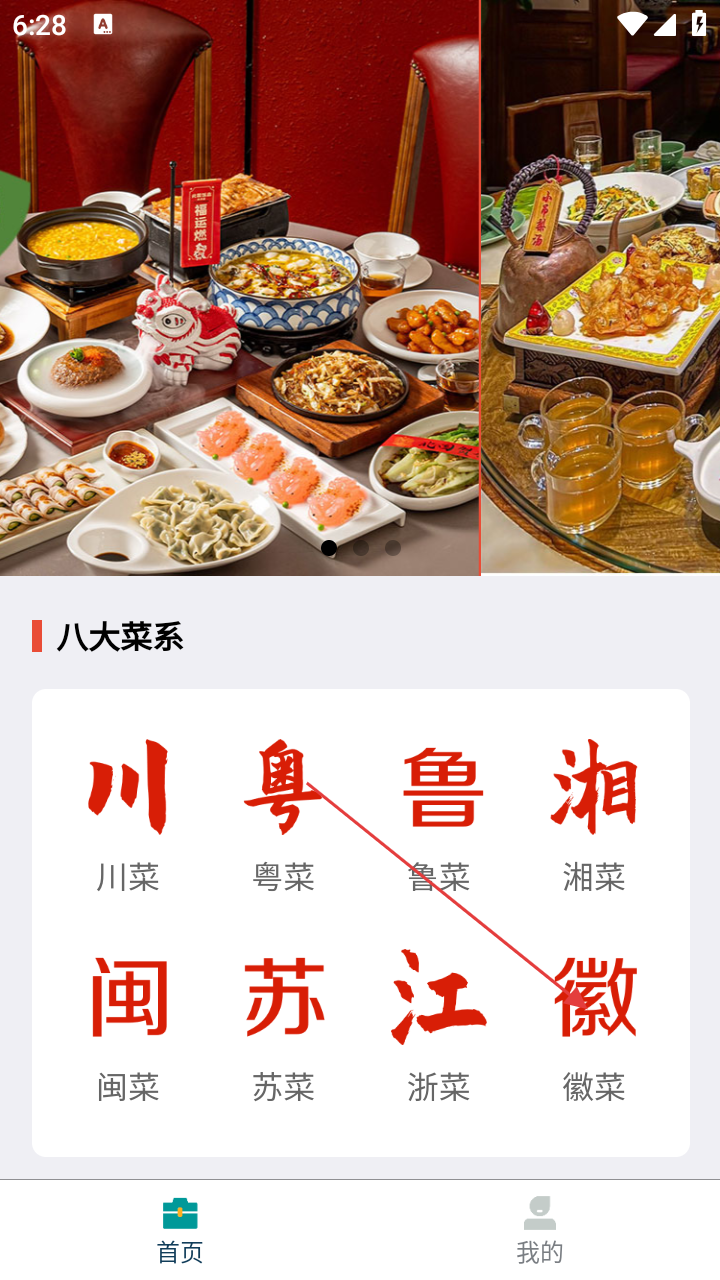 2、登陆后在首页,点击【徽菜】分类,进入徽菜菜谱列表页。