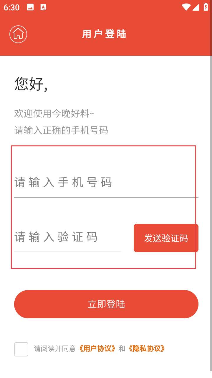1、进入【用户登陆】页,填写手机号、验证码,勾选协议后点【立即登陆】。