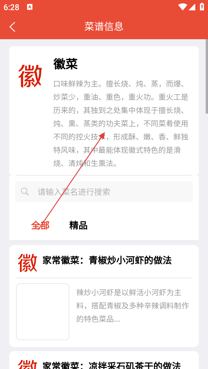 3、在菜谱信息页,选感兴趣的徽菜,进入详情页。