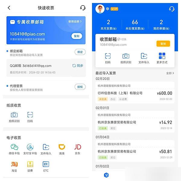 1. 全渠道发票自动归集:借助专属邮箱接收电子发票,同时支持对纸质票据进行扫码录入。不仅如此,还能与微信/支付宝卡包实现同步,并且可自动抓取短信及PDF文件中的相关内容。