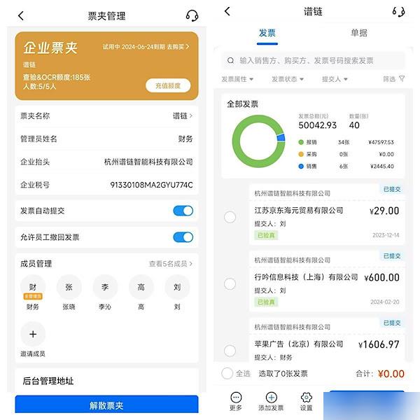 6、企业协同管票:支持多人管理同一抬头票据,发票提交后直接进入报销流程。