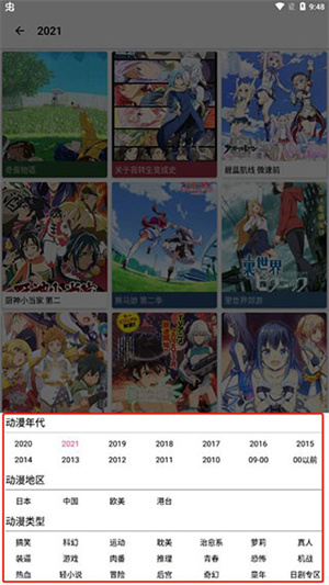 4、点开动漫分类就可以筛选年代、地区、类型来发现符合自己口味的动漫;