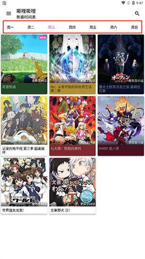 1、打开嘶哩嘶哩app出现的是每周动漫时间表,打开后将会自动定位到当前的日期,然后各位就可以知道今天所更新了哪些动漫;