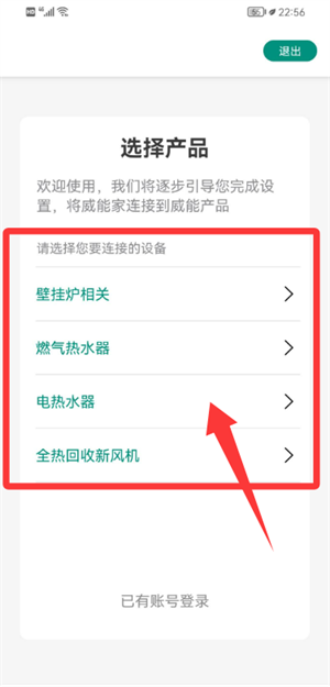 1、启动应用,在选择产品页面从壁挂炉等类型中勾选需添加的设备。