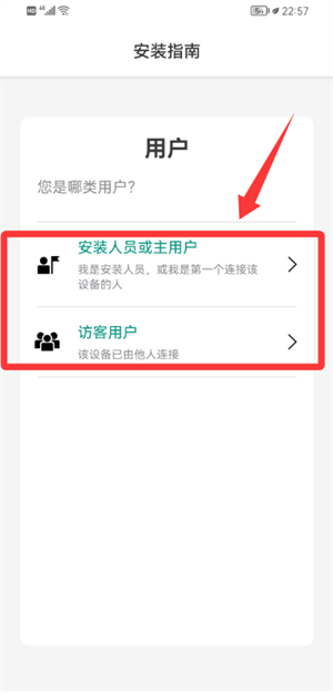 3、根据您的身份在用户类型界面选择安装人员、主用户或访客模式。