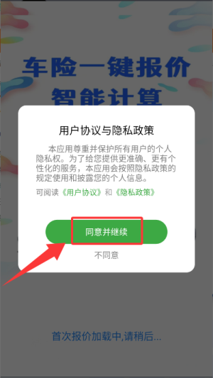 1. 开启车险相关软件,于用户协议与隐私政策弹出窗口里点击“同意并继续”。