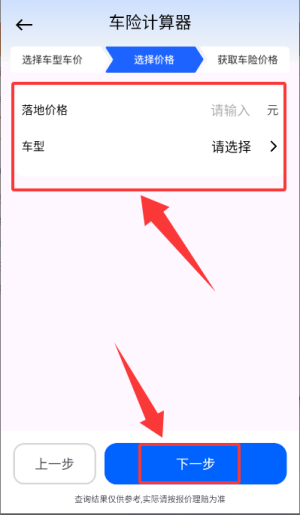 4、接着输入车辆落地价格并选择车型,再点击 “下一步”,进行后续操作。