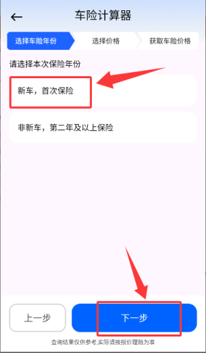 3、在车险计算器页面,选择 “新车,首次保险”,然后点击 “下一步”。